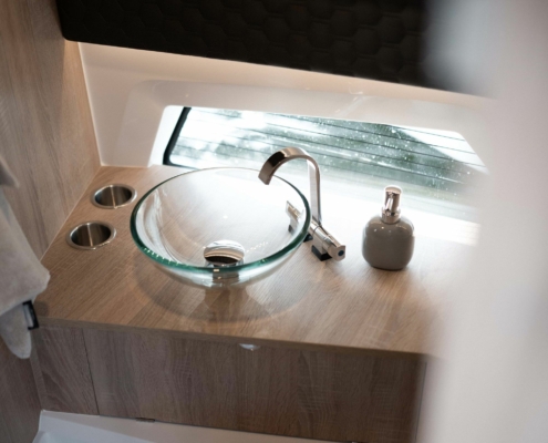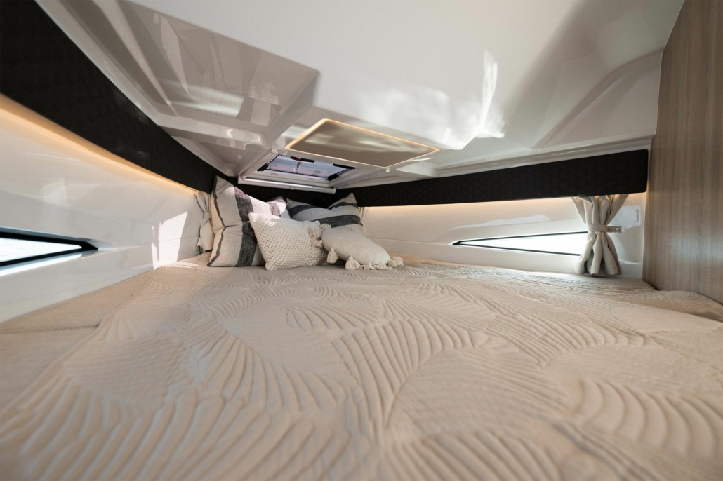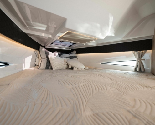 Kabinen i Coupe 830 er utformet for å maksimere plassen og naturlig lysinnslipp. De varme, lune fargene og materialet som er brukt skaper en behagelig atmosfære.