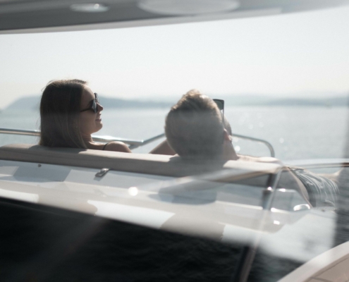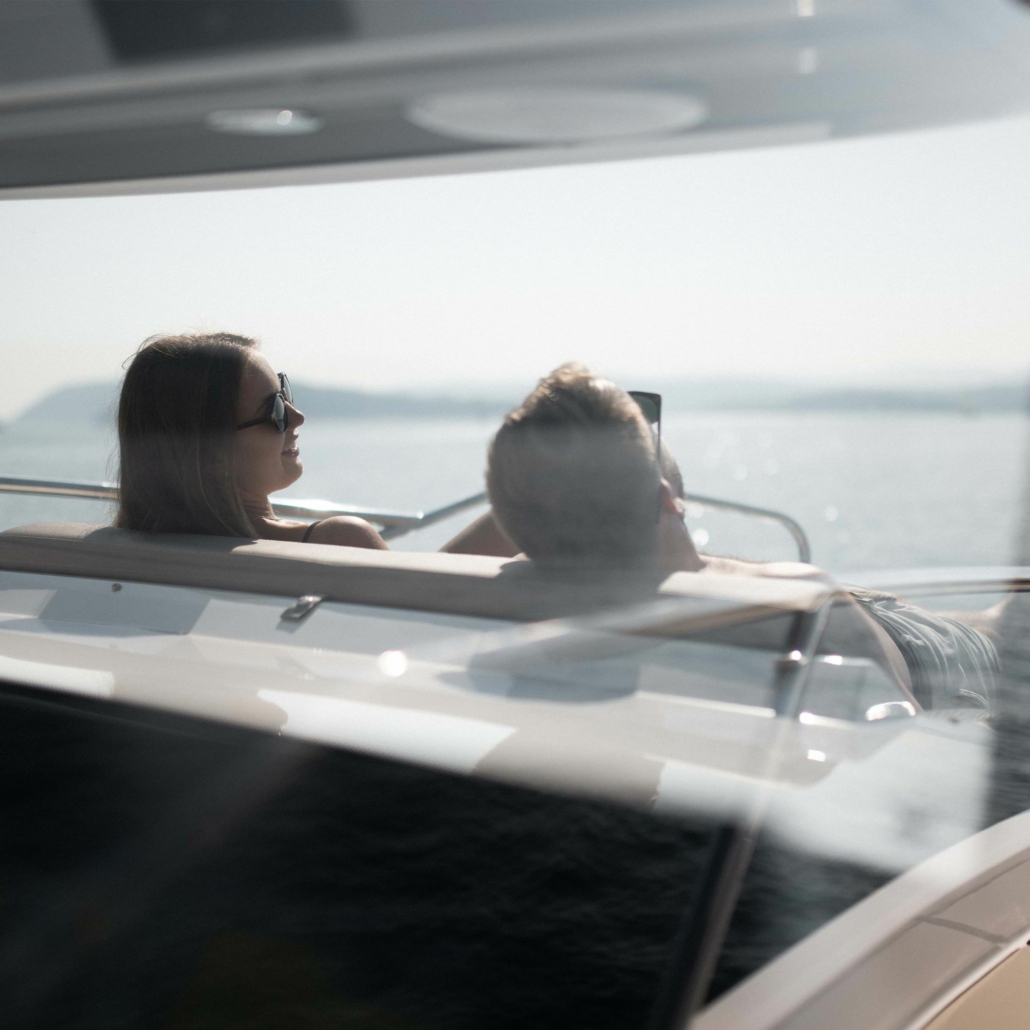 Avslapningsområdene i baugen og akter på Coupe 830 gir deg muligheten til å slappe av i ly for solen med de store solseilene.