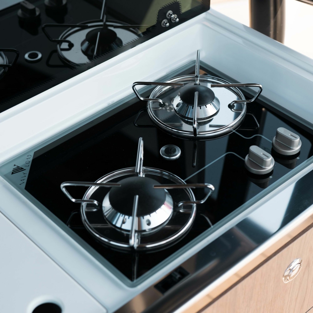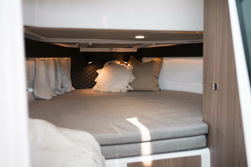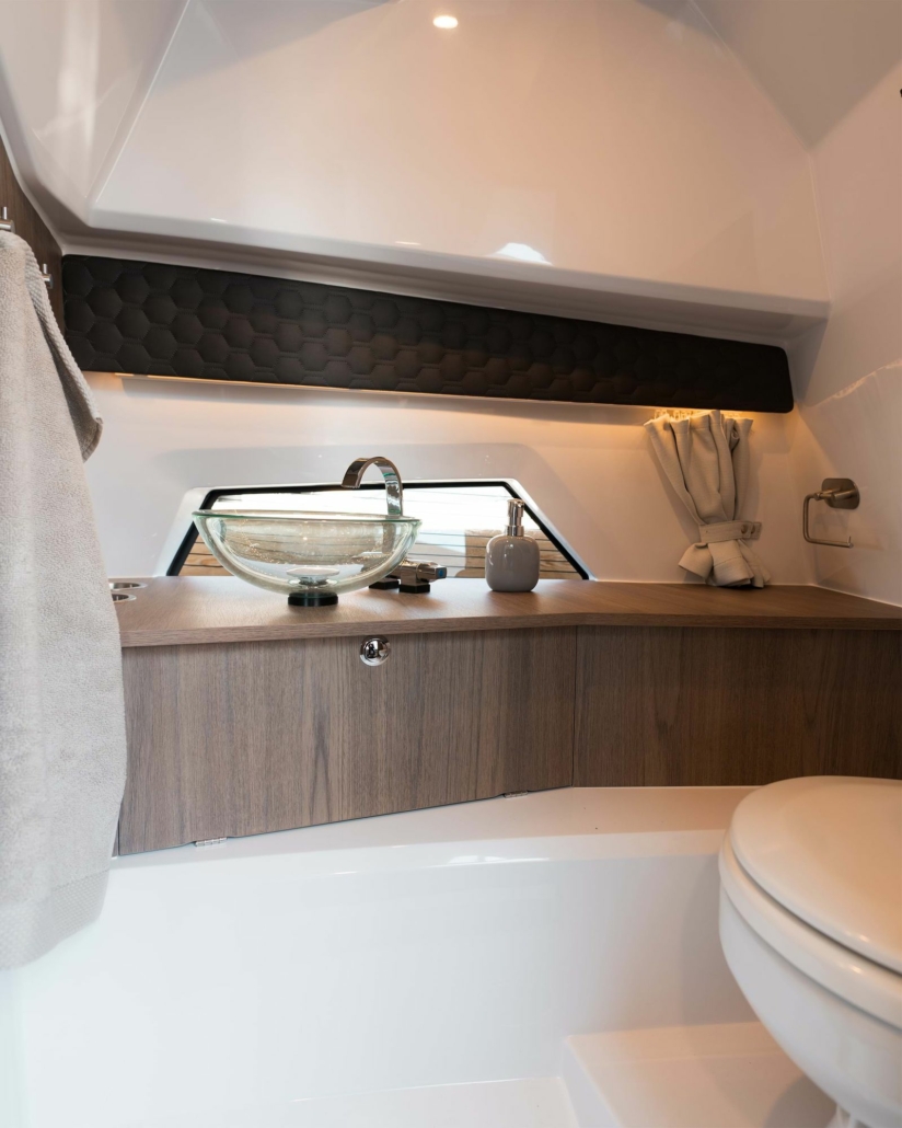 Akterloungen er området der Enduro 830 virkelig skiller seg ut fra andre skjærgårdsjeeper. Her finner du et praktisk pantry, wet bar, et solid spisebord og muligheten for en enorm solseng på 2 x 2,6 meter. Løsningen gir deg fasiliteter og funksjonalitet man ofte forbinder med typisk weekendcruisere, med den luftige og åpne følelsen man får i en skjærgårdsjeep.