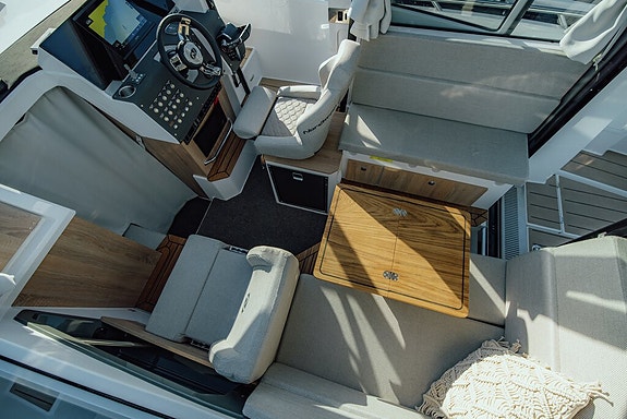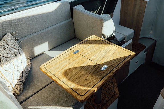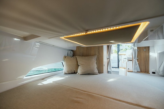 Kabinen er utstyrt med enkeltkøye på babord side og en bred, komfortabel V-køye i baugen. Coupe 905 har LED-lys som kan dimmes ned og gir hele kabinen en varmt og lun atmosfære. På styrbord side finner du et eget toalettrom med vask og elektrisk toalett med holdingstank.