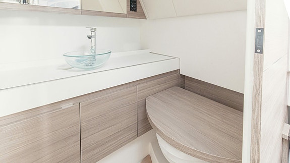 Under dekk fører to trapper til doble lugarer – forover og midtskips – som deler bad, med en valgfri tredje køye for barn.