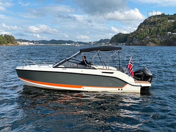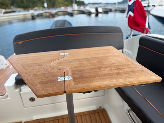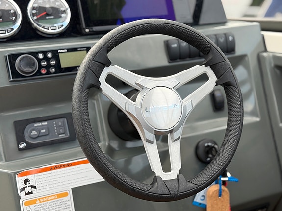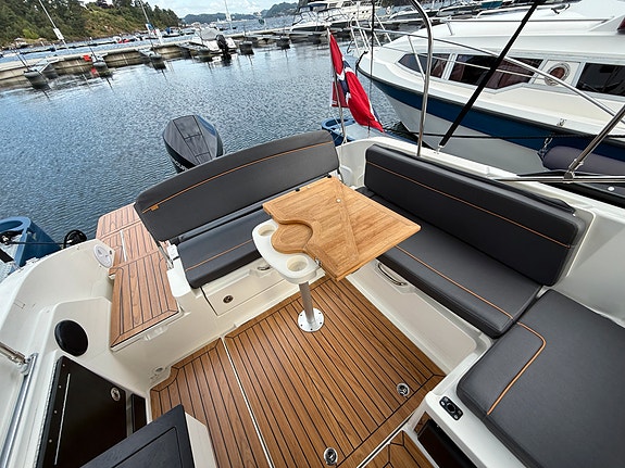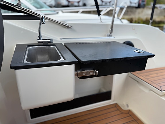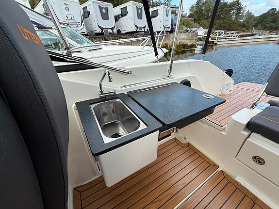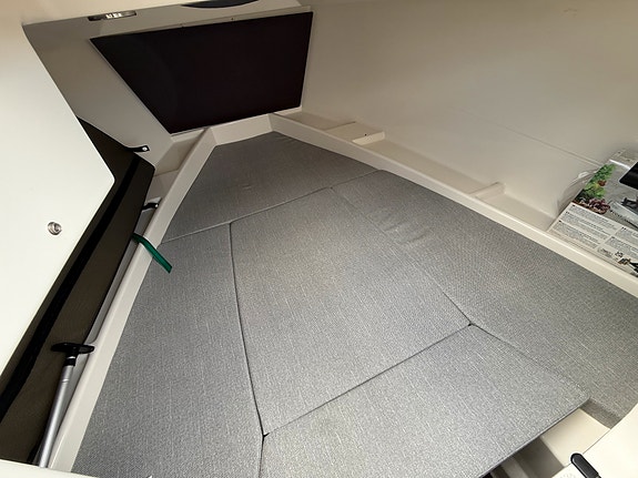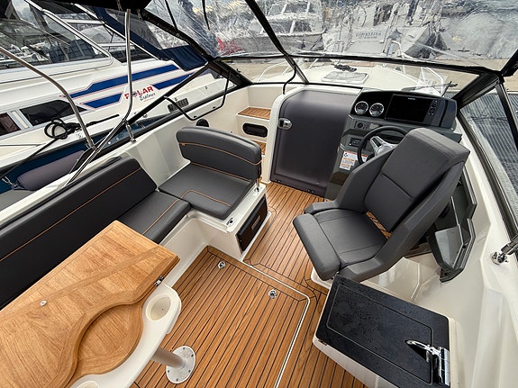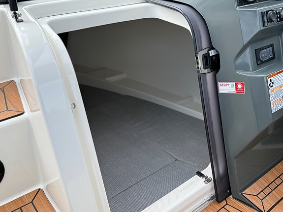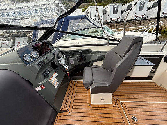 Store trinn ved babord side gir enkel tilgang til fordekket. Dette unike dekkoppsettet frigjør rom i midten av båten, hvor du finner en halvtransparent dør. Skyv den til side for å gå inn i den U-formede kabinen som kan omgjøres til en komfortabel dobbeltkøye. Rikelig med lys og ventilasjon kommer gjennom den gjennomskinnelige kabindøren, og ulike luker som kan åpnes, inkludert en dekksluke. På utsiden kan styreposisjonen utstyres med Smart Craft instrumentering og en høyteknologisk GPS på 9 tommer.