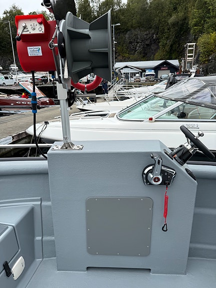 Badestige. Bakrute, Baugøye, Brannslukningsapparat, Brytere på dashbord, Bunnstoff, Cockpitdør i tekstil, Drenering fra cockpit, Drivstofftank, Fenderlist, Fortøyningspunkter akter, Kjøljern, Koppholder (2 stk.), Korte rails på tak, Lanterner, Lys i cabin, Putesett i cabin, Selvlensing, Siderute, Stuverom akter og forut, Trekkerør fra akter til baug (for montering av garn/teinehaler), USB / 12V strømuttak , Vindusvisker