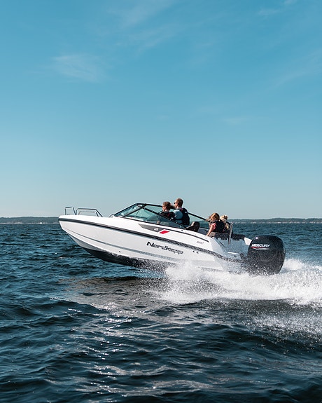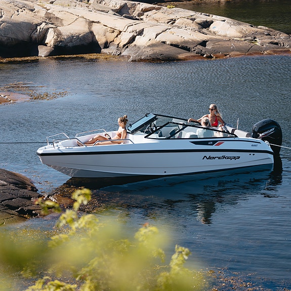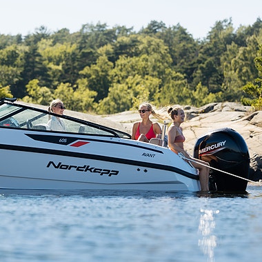 Den skarpe V-bunnen på Avant 605 gir sportslige kjøreegenskaper og komfortabel gange når du kjører rolig eller i sakte fart. Høyt fribord og det bredere baugdesignet gir enkel adgang om bord samtidig som alle sitter trygt og godt i båten. Kombinasjonen med Mercurys stillegående motorer gjør alle deler av kjøringen med Avant 605 til en sann glede.