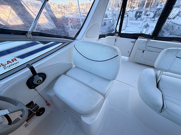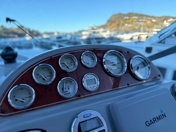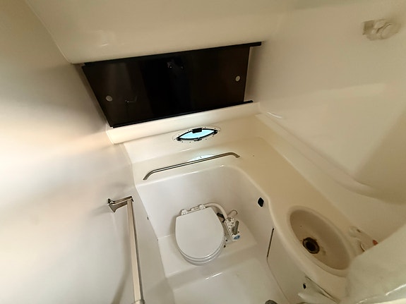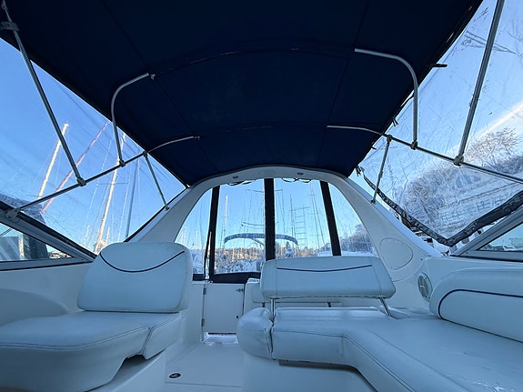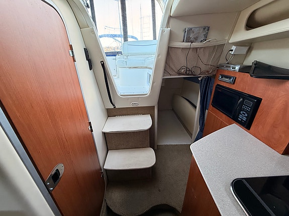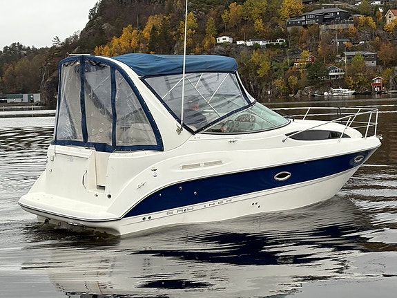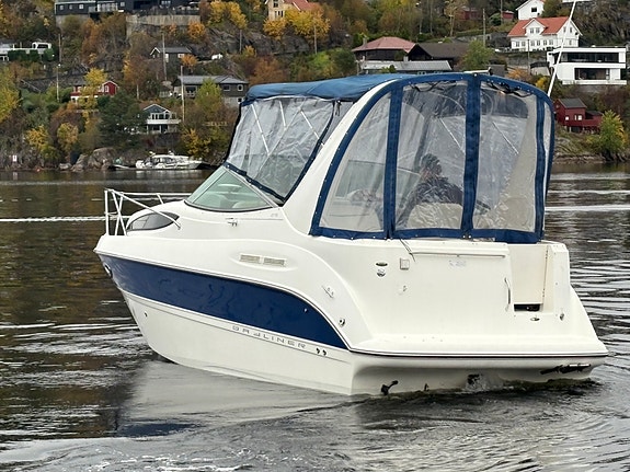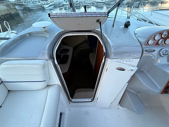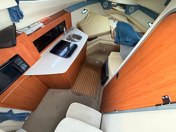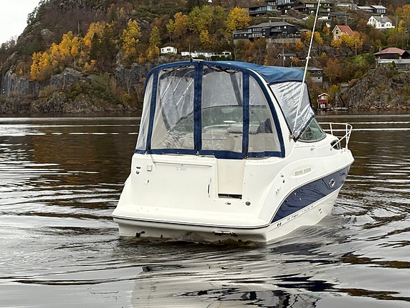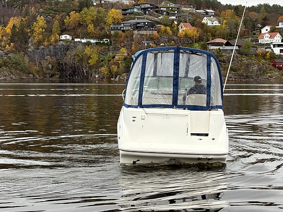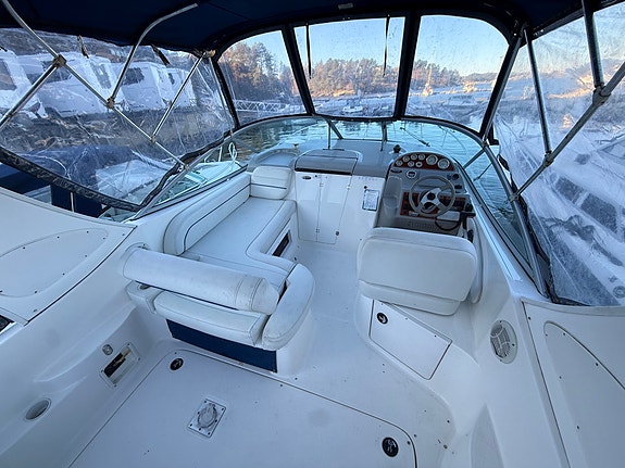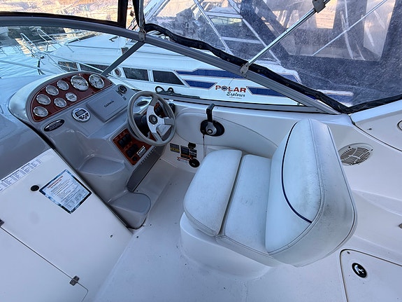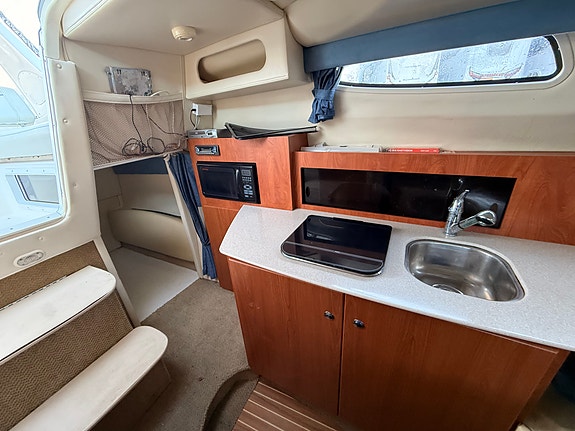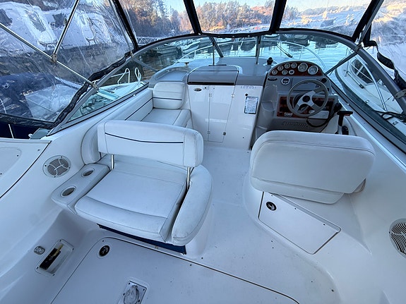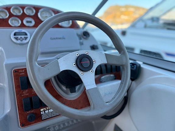 Velholdt Bayliner 275 med kraftig og økonomisk motor. Perfekt familiebåt – god plass, lavt forbruk og pålitelig drift. Båten kombinerer Sea Ray-komfort med Bayliners praktiske løsninger. Kabinen er lys og romslig med full ståhøyde, komplett bysse og eget toalettrom. Uteplassen er stor med sosial sittegruppe, førerstol, solseng og enkel adkomst til badeplattformen.