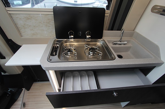 På kjøkken er det 2 kokebluss, godt med skapplass og dype skuffer.