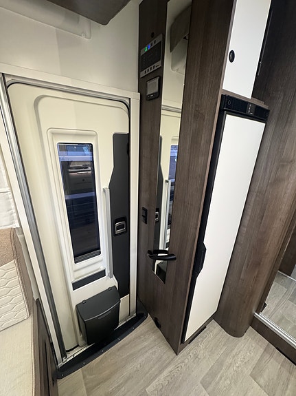 Det er er separert og romslig toalett og dusj med mulighet for å skyve igjen dør frem mot kjøkken. Meget praktisk!