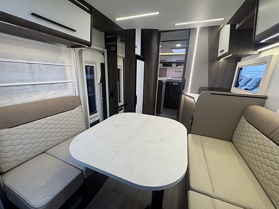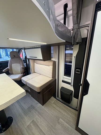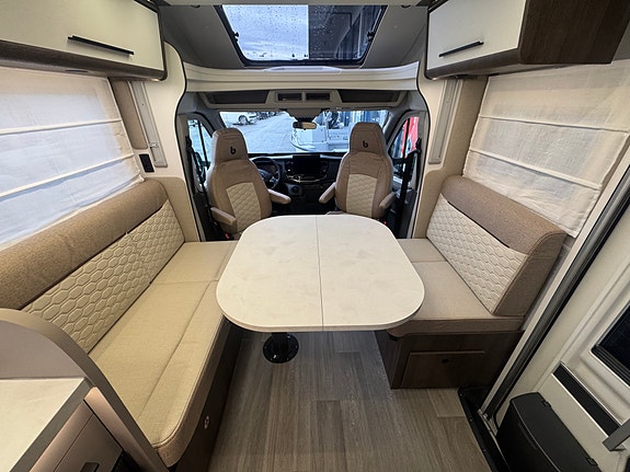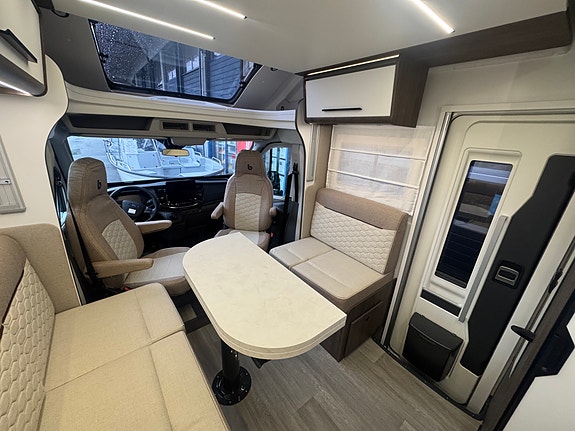 Bobilen er registrert for 4 og face-2-face salongen oppleves som meget romslig og har 2 vendbare pilotstoler i front. Det er også en elektrisk takseng over salong. Passasjerstoler ligger skjult i salong når de ikke er i bruk.