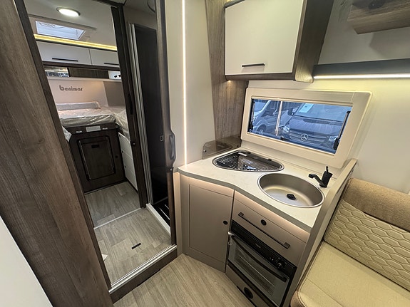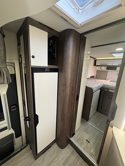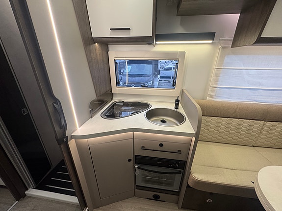 På kjøkken er det 3 gassbluss, stort kjøleskap med kjøleskuff og egen frys. Ekstra plate kan monteres ved behov for større plass. Kraftig truma varmesystem som varmer opp vann på gass/strøm.