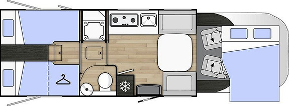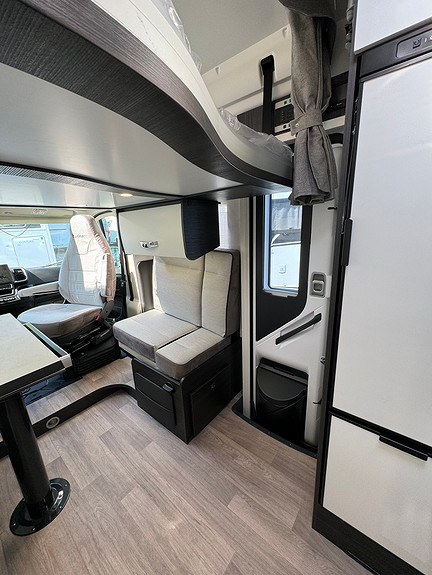 To enkle senger bak + Face 2 Face salong løsning. M/elektrisk takseng over førerhus. Meget populær planløsning, i tillegg er bobilen registrert på heavy chassis og har høy nyttelast.