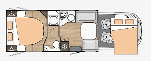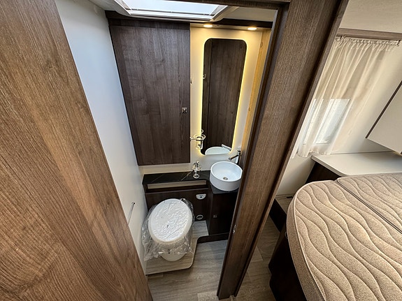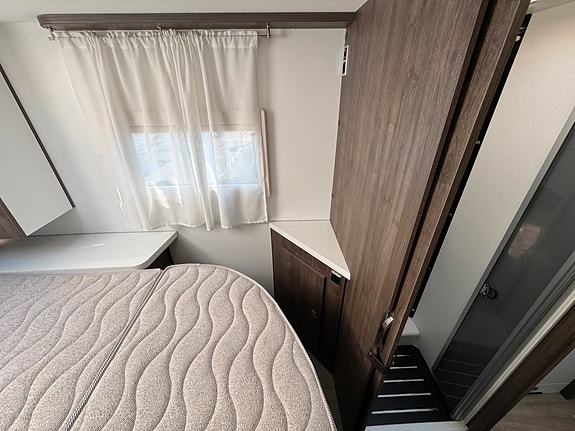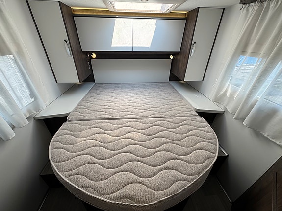 Bak er det midtstilt dobbelseng og godt med skapplass. Det er separert toalett og dusj og mulighet for å lukke igjen dør frem mot kjøkken. Det er også skyvedør fra soverom og inn mot bad/toalett. Perfekt bil for opptil 4 personer.