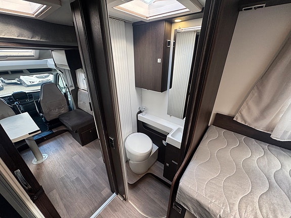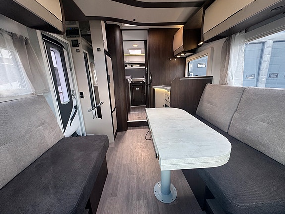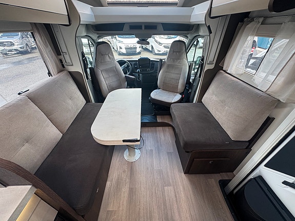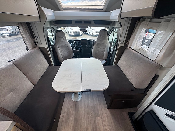 Bobilen er registrert for 4 og face-2-face salongen oppleves som meget romslig og har 2 vendbare pilotstoler i front. Det er også en elektrisk takseng over salong. Passasjerstoler ligger skjult i salong når de ikke er i bruk.