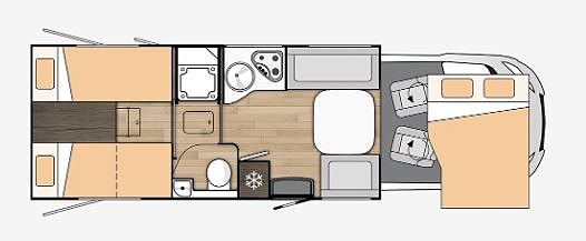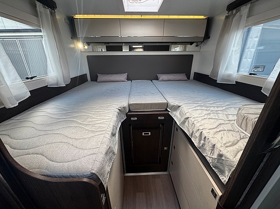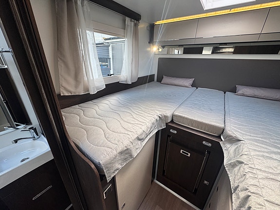 Tessoro 468 har da kombinasjonen med 2 to enkle senger bak og face 2 face løsning i salong. En meget attraktiv planløsning. Seng bak kan lett gjøres om til en stor dobbelseng ved å trekke ut plate i midten. Det er også trapp opp til seng når ikke platen står ute. Trappen kan også lukkes opp fra innsiden slik at du lett får tilgang til garasjen.
