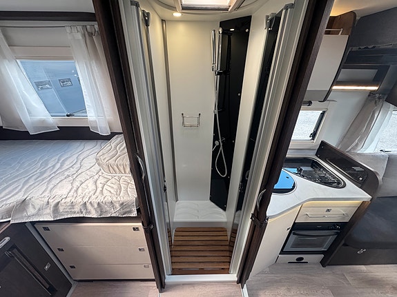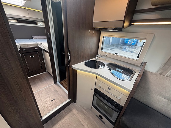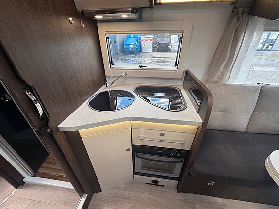 På kjøkken er det 3 gassbluss, stekeovn, kjøkkfenvifte, stort kjøleskap med kjøleskuff og egen frys. Ekstra plate kan monteres ved behov for større plass. Kraftig truma varmesystem som varmer opp vann på gass/strøm.