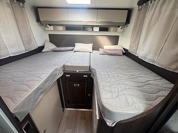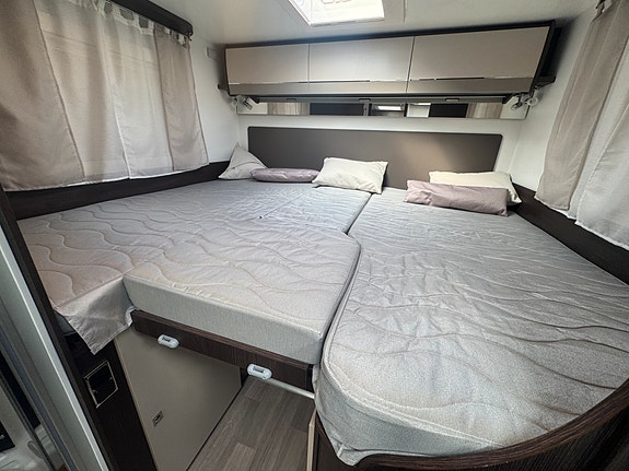 Tessoro 463 har altså to enkle senger bak, som lett kan gjøres om til en stor dobbelseng ved å trekke ut plate i midten. Det er også trapp opp til seng når ikke platen står ute.