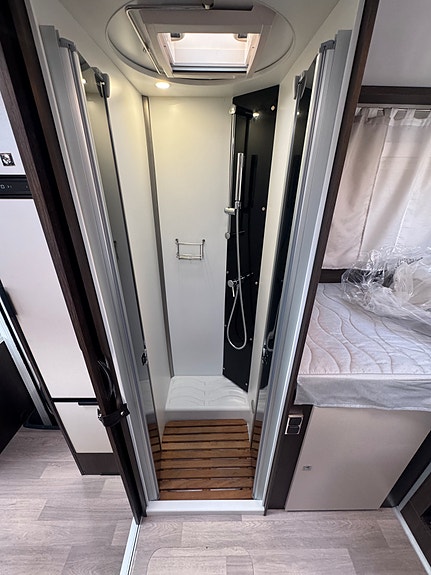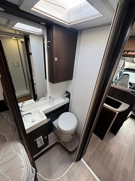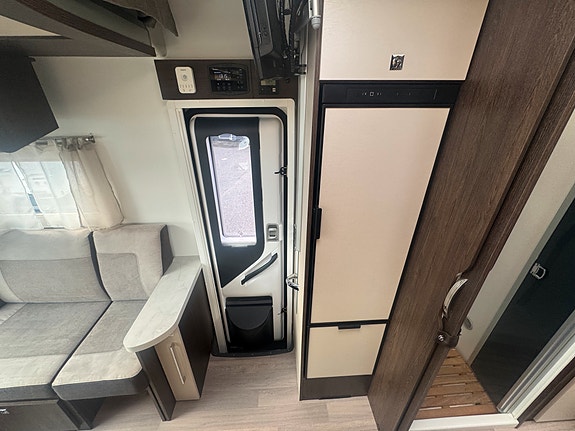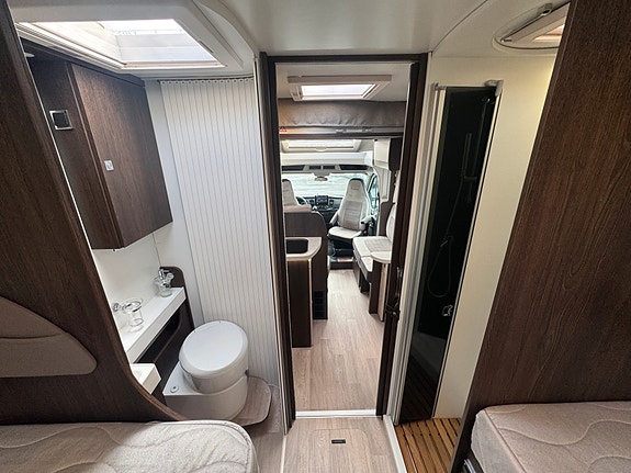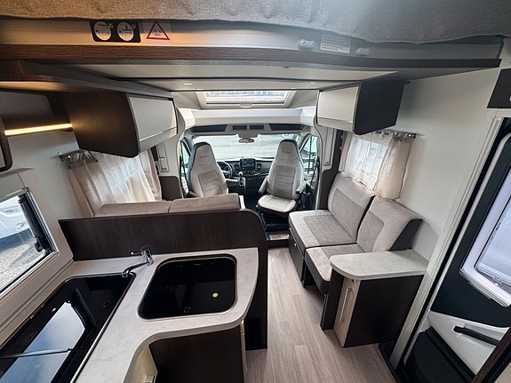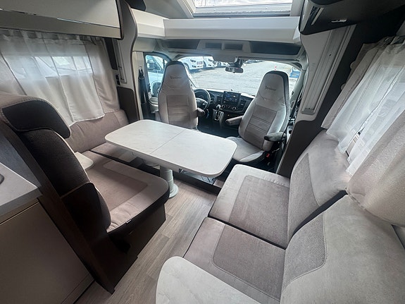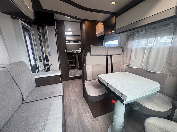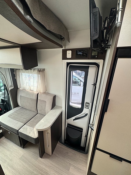 Bobilen er registrert for 4, salong er romslig og har 2 vendbare pilotstoler i front. Det er også en elektrisk takseng over salong, denne kan være nede uten at den står i veien for bodelsdør!