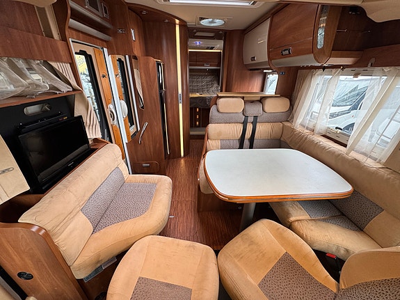 Romslig L-Sittegruppe, her har du plass til hele familien! Tv ligger skjult i benk når ikke i bruk, manuell takseng kan senkes over førerhus v/behov for ekstra sengeplass.