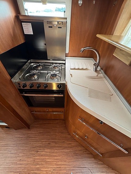 På kjøkken er det store benkeplater, ventilator m/lys, dype skuffer for lagring av kjøkkenutstyr, stekeovn, 4 kokebluss, stort kjøleskap m/frys. Det er også plassert en el.takvifte i tak over kjøkken, meget praktisk!