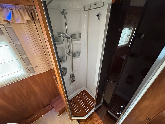 Separert toalett og dusj, oppleves romslig og mulighet for å lukke igjen dør frem mot kjøkken + gardin kan lukke igjen bak mot soverom. Vindu og takvindu på toalett og takluke v/dusj.