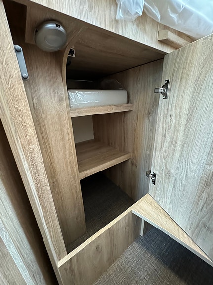 Bak i bilen er det to enkle senger, som lett kan gjøres om til stor dobbelseng. Det er godt med skapplass under og over seg. I tillegg så har denne modellen stor garasjeplass med plass til sykler om ønskelig.