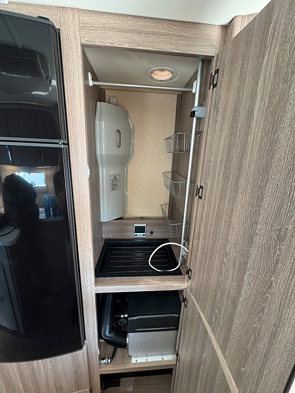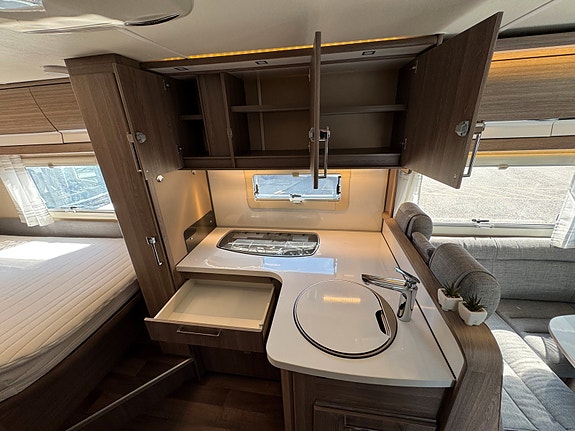 3 kokebluss, dype skuffer og skap. Stort kjøleskap med frys, denne justeres automatisk og veksler mellom 12v, gass og 230. Gode oppbevaringsmulighet for alt av kjøkkenutstyr.