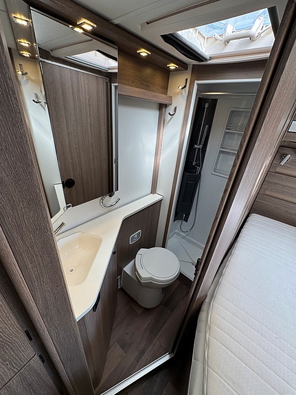 En flott planløsning med sidestilt dobbelseng bak og romslig bad. – Registrert for 4 personer. Da bobilen ikke har takseng føles bobilen meget romslig ut og har ekstra takhøyde. Må sees! 🙂