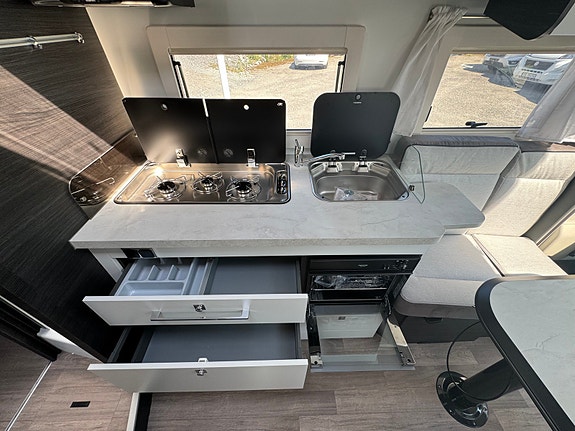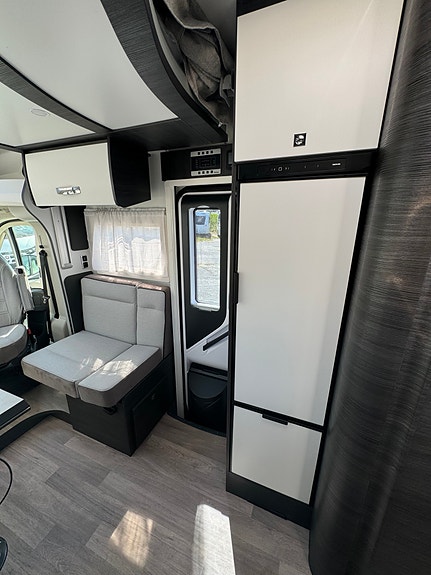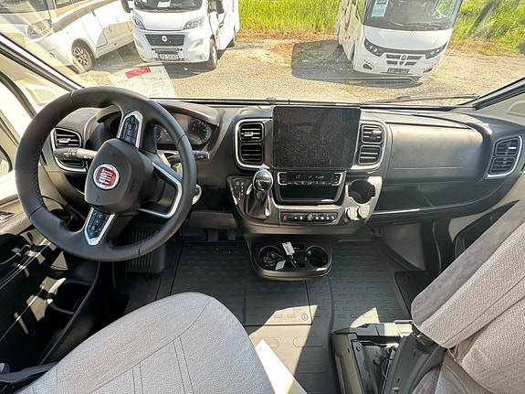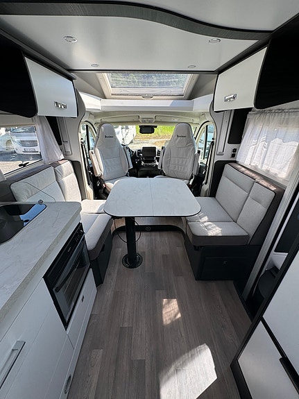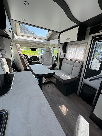 STERKE SIDER Stue med ansikt til ansikt sofaer og sammenleggbare bord Senkeseng (230kg max) Stor AES kjøleskap (140l) med separate 9 flaskers (1.5l) oppbevaring Dør mellom soverom og salong Qeensbed (150 cm) – Midtstilt seng Baderom med separat dusj Romslig garasje med 2 dører og bilstil på låsene Mer detaljer info om bobilen: – Full poliester karosseri – Sidevegger og tak uten treverk, ikke mulighet for å råtne – 100% forsterket polyester bildel overgang – Panorama takluke med myggnett og formørkelse (71x105cm) – Vindu med dobbelt glass Dometic D-Lux – Inngangsdør med 2 låser, vindu, myggnett og søppelbøtte – Bakfanger med LED lys – Nye dørlåser I “bilstil” på bodelsluker – LED lys – Soft close skuffer – Avtagbare putetrekk – Skilledør mellom soverom og sittegruppe – Elektrisk senkeseng framme (230kg maks) – Høyderegulerbar seng bak (manuell) – Skuffer under bakre seng – TV feste – Vask og 3 kokebluss med elektrisk tenning – Stort kjøleskap på 140l med separat del til 9×1,5l flasker – Separat dusj med oppbevaringsboks og håndklestang – Truma combi gas 4000W – Elektrisk vindu – Sentral lås med fjernkontroll – ABS + ESP – Cruise control – Aircondition bildel – Sjåfør + passasjer airbag – Skinn ratt – Dybde og høyde regulerbart ratt – Girspak i skinn – Radio med USB, aux og blåtann styres ved rattet – Multifunskjonsratt med radio styring – Liggende svingbare kapteinstoler med 2 armlener og høydejustering – Setetrekk likt resten av bodelen også framme – Førerstoler med regulerbar korsryggstøtte