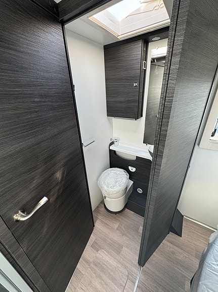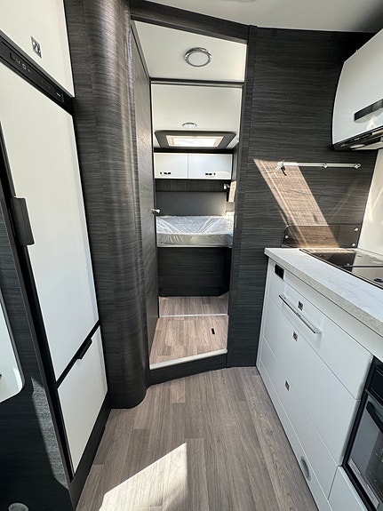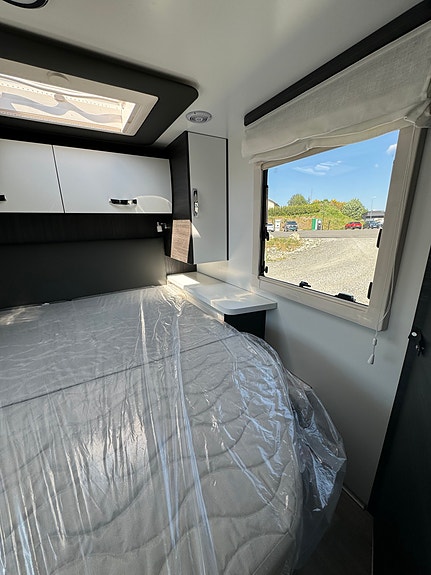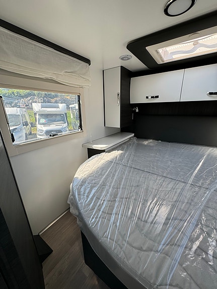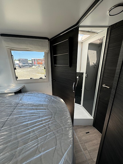 Bak er det midtstilt dobbelseng og godt med skapplass. Det er separert toalett og dusj og mulighet for å lukke igjen dør frem mot kjøkken. Det er også skyvedør fra soverom og inn mot bad/toalett. Perfekt bil for opptil 4 personer.