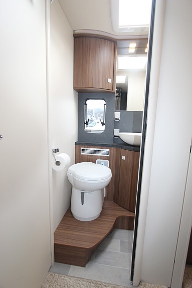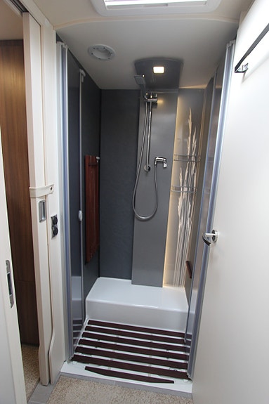Dusj og toalett er adskilt, godt med plass her! Det er dører bak mot seng og frem mot kjøkken. Badet kan med andre ord være helt avlukket.
