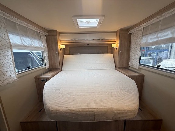 En fantastisk flott planløsning med midtstilt dobbelseng bak. Separert toalett og dusj med skyvedør frem mot kjøkken.