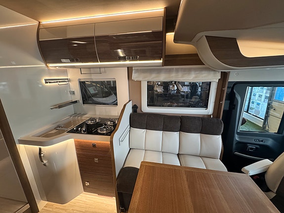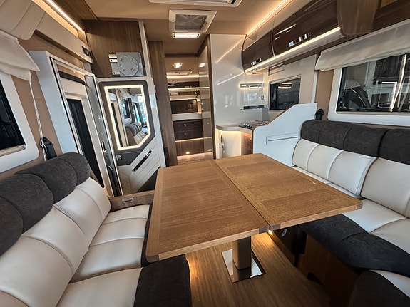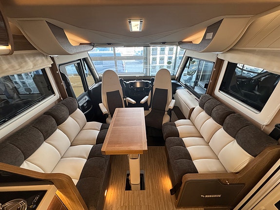 «Face to Face» løsningen ved salong gjør at du får en meget romslig sittegruppe, spesielt siden salongbord er foldbart. passasjer 3 og 4 vil også sitte behagelig under kjøring ved denne type løsning. Disse ligger skjult i salong når de ikke er i bruk.Takseng i front kan være nede uten at det går utover salong.