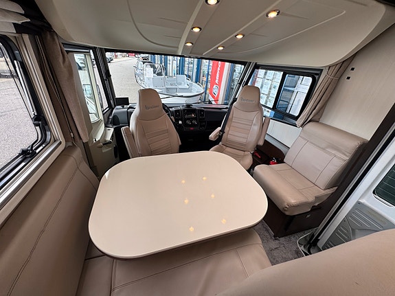Romslig L-salong med vendbare pilotstoler i front. En meget innbydende salong med flotte farger – Må ses!