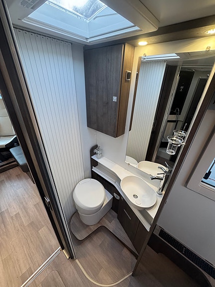 Bak er det altså en midstilt dobbelseng med regulerbar senking og heving, separert toalett og dusj med skyvedør frem mot kjøkken.