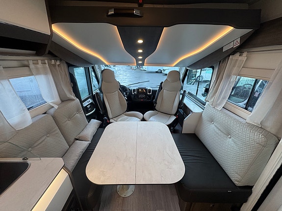 «Face to Face» løsningen ved salong gjør at du får en meget romslig og luftig sittegruppe, spesielt siden salongbord er foldbart. passasjer 3 og 4 vil også sitte behagelig under kjøring ved denne type løsning. Disse ligger skjult i salong når de ikke er i bruk. Takseng i front kan være nede uten at det går utover salong.